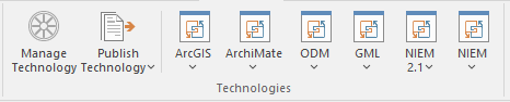The 'Technologies' panel provides the icons for managing and publishing MDG Technologies in Enterprise Architect, and also an icon for each enabled MDG Technology available in your installation of Enterprise Architect. This topic identifies some of the Technologies that might be represented here. Each Technology icon displays a drop-down list of options for working with the Technology. These options might include: