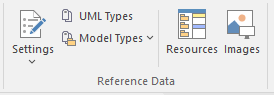 The 'Reference Data' panel is used to set up and manage the metadata for a model. Reference data such as Resources and Images is generally added as the model evolves. A wide range of additional model content such as Templates, Profiles, Patterns and Relationship Matrices can be stored as Resources. Images can be saved in the model and used as alternatives to the conventional geometric representations of elements, to appeal to non-technical audiences.