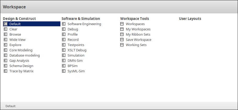 This window allows you to select from a range of predefined workspace layouts and apply one of them, such that the application desktop displays a particular set of windows and toolbars, arranged in a way to facilitate certain modeling activities.