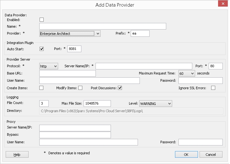 This group of settings defines the details of the external data provider, such as Dropbox, Jira or TFS. The Integration Plug-in will use the defined details to connect to the remote system and retrieve data from it so that it can be sent back to Enterprise Architect. The combination of 'Protocol', 'Server Name 'and 'Port' must be resolvable by the server hosting the Integration Plug-in, which in the simplest case is the Pro Cloud Server.