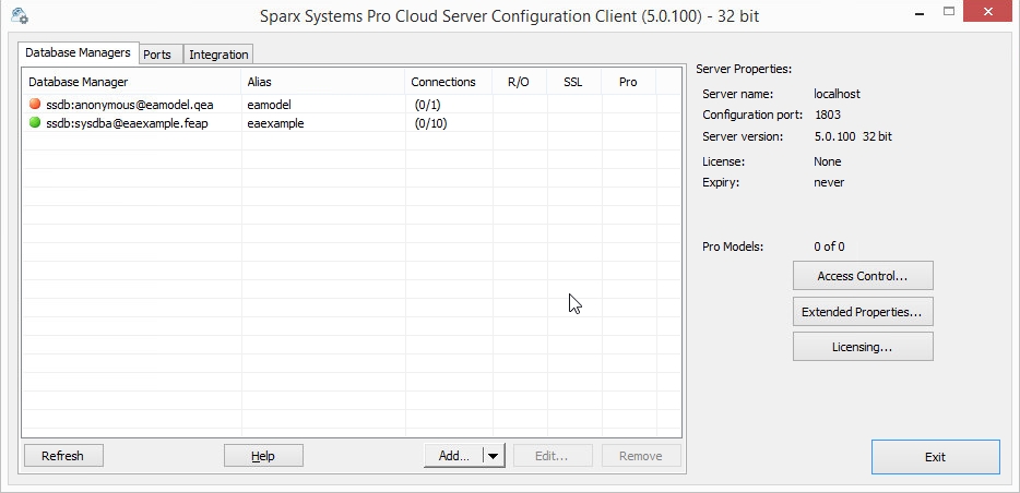 This screen shows a list of all defined database managers and the details of the connected Pro Cloud Server.  It is also the entry point for all management functions, such as configuring your License, setting the ports the Pro Cloud Server listens on, and maintaining database connections.