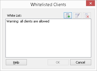 The Whitelisted Clients screen displays when you click on the 'Access Control' button on the Main screen. It allows you to configure the what Enterprise Architect clients are authorized to communicate with the Pro Cloud Server. By default all clients are authorized, however if your environment requires a higher level of security then it is possible to limit exactly what clients can access the Pro Cloud Server.
