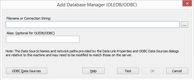This note is shown on the Add Database Manager (OLEDB/ODBC) screen: