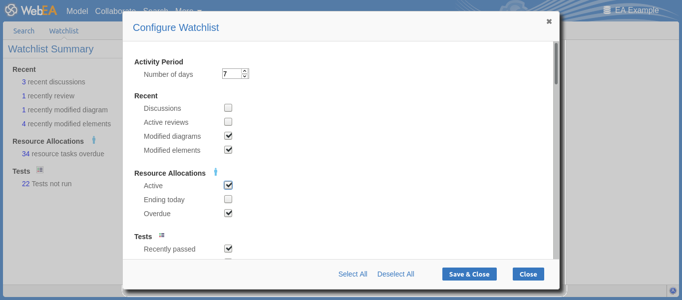 Once you have finished choosing which items to monitor, click on the Save & to save the configuration and refresh the Watchlist summary. Alternatively you can use the Close button to discard any changes.