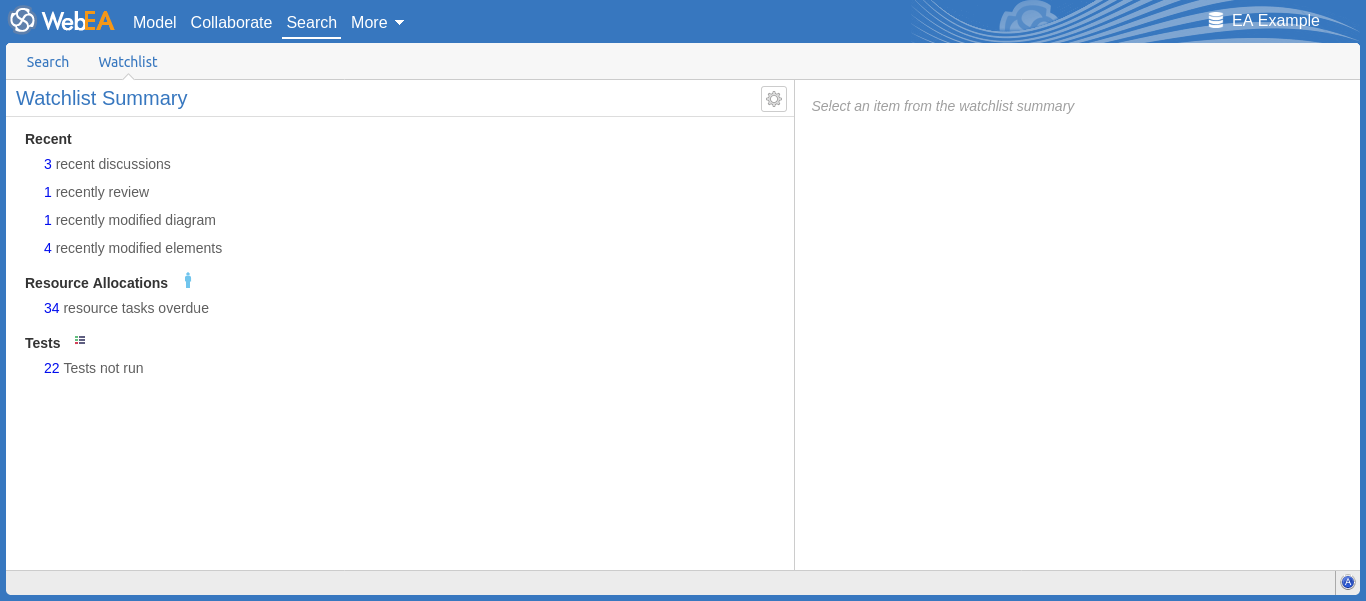 The Watchlist facility in WebEA helps you to quickly identify recent activity in the model. Each user can tailor their Watchlist to monitor activity in any of a wide range of objects and features with various characteristics. Whenever the Watchlist Summary is generated, all object types of interest are checked for recent activity and a count of matched objects displayed. All matched object counts can be clicked on to display the list of objects that match the particular activity type.