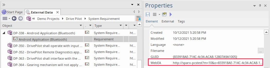 The elements created from external items can be referenced from the external application via a hyperlink back to the element details hosted on WebEA. The benefits of using WebEA as the reference include: