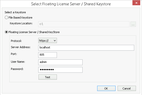 Selecting the 'Link to...' option will display a prompt for the connection details of an existing Floating License Server (or key store) to be added to the list of connected stores.