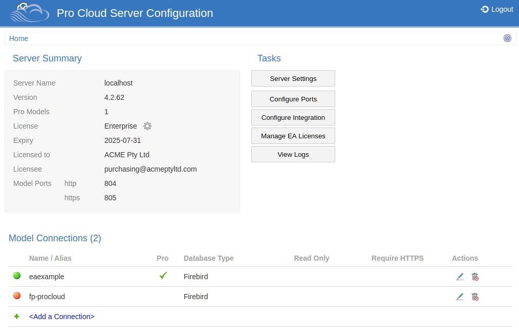 The Pro Cloud Server Configuration 'Home' page has three sections - 'Server Summary', 'Tasks' and 'Model Connections'.