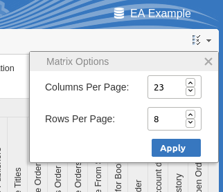 If necessary you can also increase number of columns/rows which are displayed per page by using the Matrix Options button. Note, the number of cells per page will have an impact on the web browser performance, so avoid using pages with a large number of cells (e.g. more than 200 x 200).