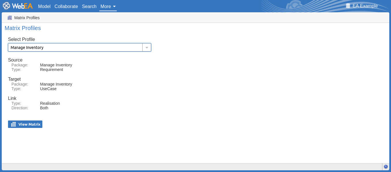 The 'Matrix Profiles' page provides the 'Select Profile' drop-down field that you use to list and select from the matrix profiles defined within Enterprise Architect.  You cannot add to or edit these profiles.