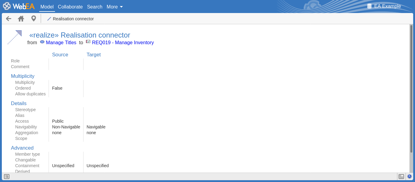 Clicking on a square containing an arrow displays the 'Relationship Properties' screen for the relationship represented by that arrow. On that screen you can click on the source or target element names and display the 'Element Properties' screen for those elements.