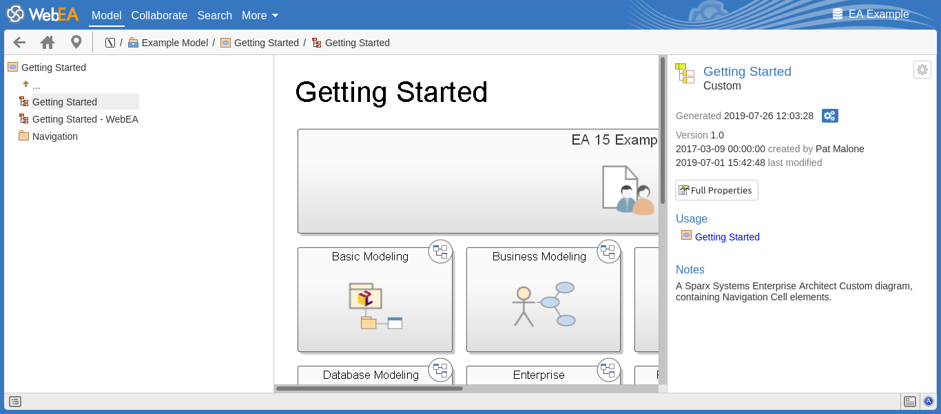 The next image shows the WebEA screen after loading the example model, when a default diagram has been configured.