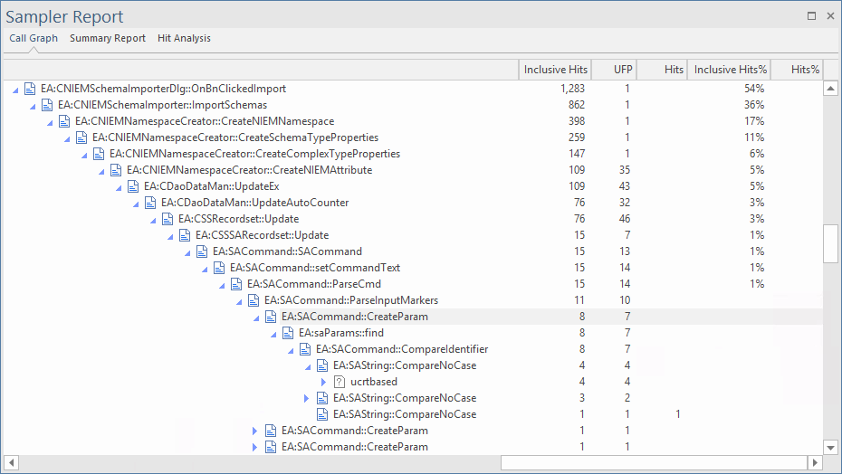 Results are displayed in a Report view. The report opens with three tabs initially visible: the Call Graph, the Summary Report (Function Summary) and the Hit Analysis tabs. The reports can be saved to file, stored in the model as Artifacts or posted in the Model Library.