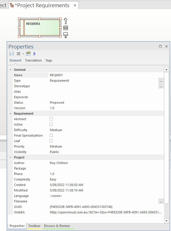 Click on the diagram at the location where you want to place the element. ![]() The new element is created as a child of the Package that contains the diagram, and is placed onto the diagram at the cursor position. The element's initial details are displayed in the Properties window. |