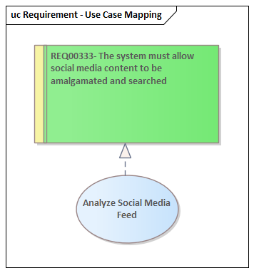 Creating diagrams is one of the easiest and most common ways to add content to your repository. When you add elements and connectors from the Toolbox to a new or existing diagram, these elements and connectors are also created and added to the Package that contains the diagram. The added elements will be immediately visible in the Browser window. In this example, a modeler has added a new Requirement and Use Case to the diagram and connected them using a UML Realization relationship.