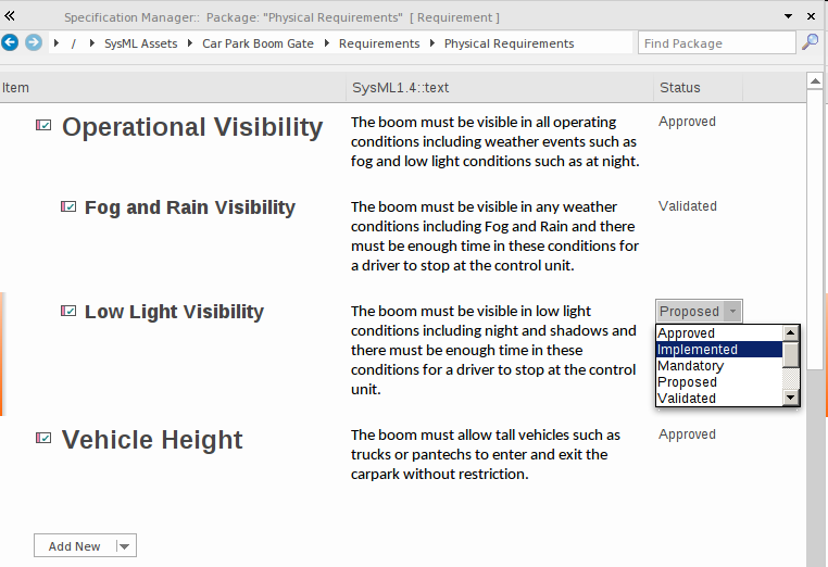 The Specification Manager is a great tool for viewing or adding content to the repository using a familiar word processor or spreadsheet-style interface. It is particularly useful when you have a list of items that contain descriptive names and textual descriptions, such as Requirements and Capabilities, but it can be used for any element, including information classes, processes, decisions, and more. It is a refreshing alternative to working with diagrams and a welcomed method for many business and technical team members who create or view catalogs of items. You can switch to other views from the Specification Manager, such as lists, diagrams, and Gantt views.