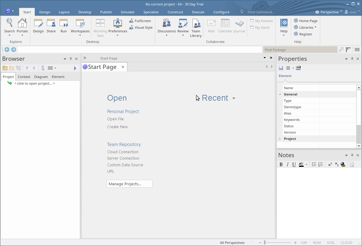 When Enterprise Architect starts up there is no current repository selected. Before you can start modeling and creating diagrams you will need to either open an existing model or create a new one. If this is your first time working with Enterprise Architect and you don't have any existing models to use, you should create a new file based repository that you can experiment and play in while you learn about modeling and using Enterprise Architect.