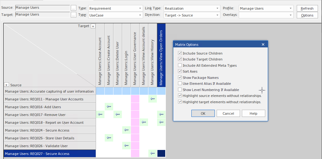 The Relationship Matrix is a tool for visualizing the relationships between elements in a visually compelling view, resembling a matrix or spreadsheet. You can use the matrix to view the relationship between any two elements; for example - between Stakeholders and their Requirements, how Use Cases relate to Business Requirements or Functional Requirements, how Capabilities relate to Business Drivers, or which Components implement a set of requirements. The matrix has great appeal for non-technical stakeholders and can be included in documentation and viewed through WebEA, and even saved to a spreadsheet. You can also create relationships through the matrix and visualize which elements are loners and don't have any connections.