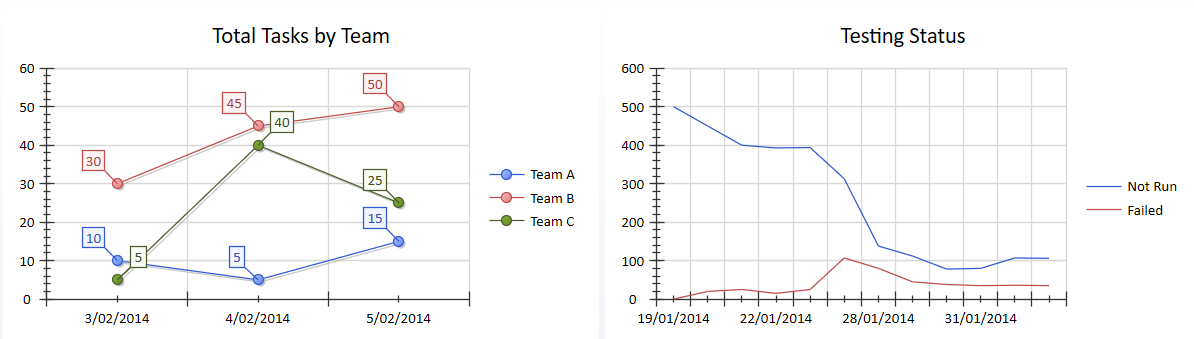 Using Dashboard diagrams, you can create high-quality charts and graphs that display repository information in a visually compelling way, such as the ratio of a Requirement Priority like Status in a Pie Chart, or the task allocation in a Time-Series Chart. There is a Toolbox page of pre-configured charts and graphs, but you are free to create and save any number of charts, sourcing data from anywhere in the repository. The charts and graphs provide valuable summary information that helps you manage all aspects of the repository, including properties like Status and Resource Allocation.