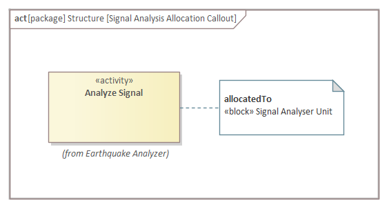 It is also possible to show the relationship in a callout notation, where a note is connected to the element and displays the name of the relationship and the details of the related element. This diagram shows the notation for an Activity, showing the Block that it has been allocated to. To achieve this an engineer must: