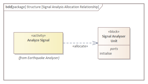 A fundamental aspect or discipline in Systems Engineering is to relate structural elements with behavioral elements. These two important aspects of a model will become intertwined as a model develops, but when a number of engineers start work to define the system it is often difficult to say exactly how the behavior and the structure will be related. The Allocation relationship is particularly useful in these situations. It can be used as a way of showing the relationship between behavioral elements and structural elements that will inform the more rigorous modeling that will be employed as the notions described in the model become more certain.