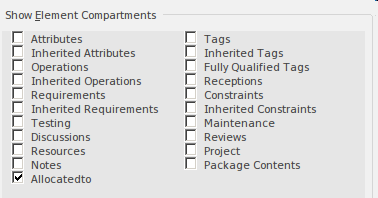 Enterprise Architect also supports a number of other ways of representing the Allocation relationship, including as a compartment in either the behavior or structure element.