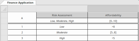 The values or variables in these expressions must be provided through Input Data, which should be visible in the Decision Requirement diagram. The universe of available or possible input values or ranges will typically have been discussed at the definition level, and these form an all important reference for the Decision Table definition. For example, the decision for a loan application might rely on an input of Customer Level, which could be defined in the business as an enumeration of values - 'Gold, Silver, Bronze' - and could also depend on a simple Age value defined as '18 < Age < 65'. It is important when defining the rules and their logic within the table to include these constraints, as it will make the table easier to understand for humans and easier to validate for the tool. Without these being defined a modeler might assume the table is complete, but the validator could possibly prescribe otherwise.