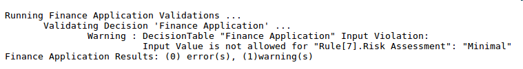 This screenshot shows that a modeler has defined the allowable values for the input columns for the Finance Application Decision Table. The risk assessment input is only allowed to have three values, namely High, Moderate and Low. A value such a Minimal, if listed in the table, would result in a validation error. We will look at validation extensively in a subsequent section of the Guide, but this is an example output from the validation facility in the case where 'Minimal' is erroneously used, as we have discussed.
