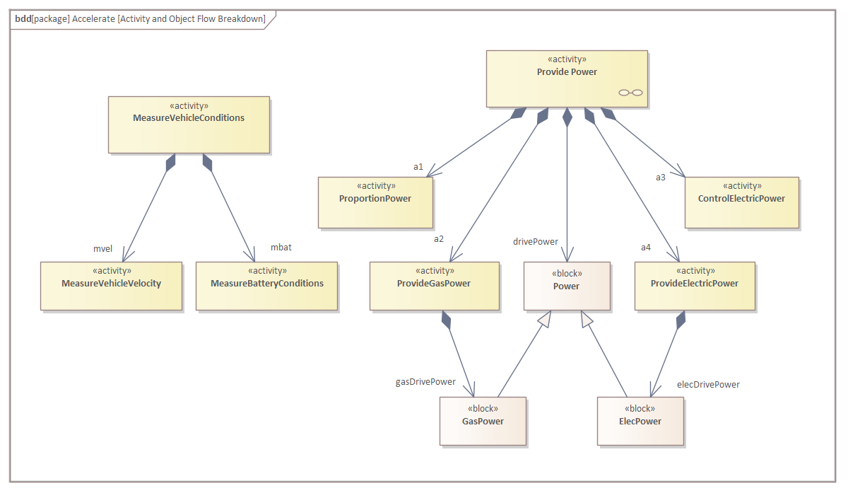This Block Definition diagram shows the decomposition of the Provide Power Activity from the diagram in the previous topic. It is important to note that this is a functional decomposition and, as such, it defines structural relationships between the Activities in the hierarchy and so should be modeled on a Block Definition diagram.