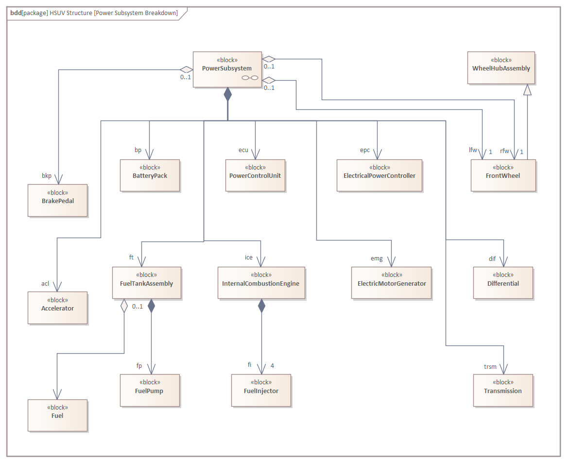 In the previous two sections we have seen how a system can be broken down into a number of sub-systems and that this breakdown can be represented on a Block Definition diagram. We also saw how the subsystems can be related to each in the context of the overall system and how these could be represented on an Internal Block diagram. We will now look at how one of these sub-systems (the Power Subsystem) can be broken down into a number of constituent parts again using the Block definition diagram.
