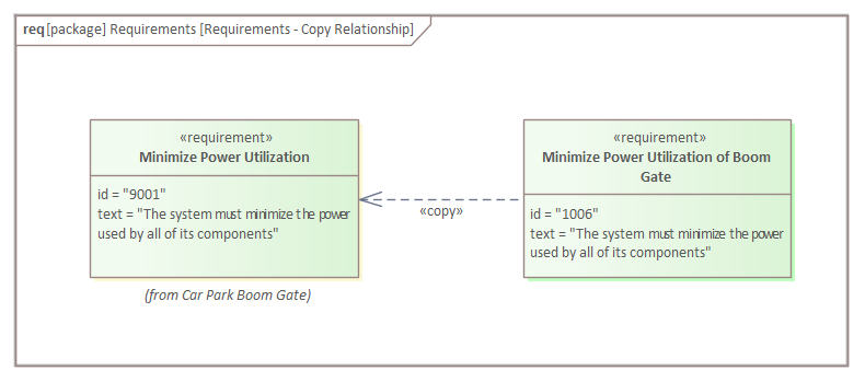 The Copy relationship is a relationship between two Requirements; it is used to show that one Requirement is a copy of another. The relationship is a type of Dependency and is represented by a dashed line with the keyword <<copy>>, with an open arrow head pointing from the Copied (Client) to the Base Requirement (Supplier). Given that Requirements elicitation, and management are expensive and time consuming activities, and that many projects often have an overlap of interests, it is useful to re-use Requirements; the Copy relationship provides a mechanism to do this. The base Requirement is typically stored in another project's namespace but it is considered good practice to move the common (base) Requirements to a namespace that sits above the level of individual projects.