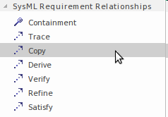 The Copy relationship is available from the Relationships page of the SysML Requirements Toolbox.