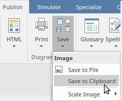 The model content in Enterprise Architect, including diagrams, can be shared with other users and tools, allowing the model content to be visualized in other contexts. Diagrams can be simply copied to the clipboard and then pasted into any other application such as a slide presentation, word processor document, web page or email. This option is available from the Diagram Image panel of the Publish ribbon.