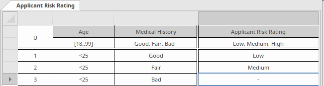 In this example there are two input columns - Age and Medical History. For the output of Applicant Risk Factor = Medium, the Applicants Age <25 AND their Medical History must be Fair.
