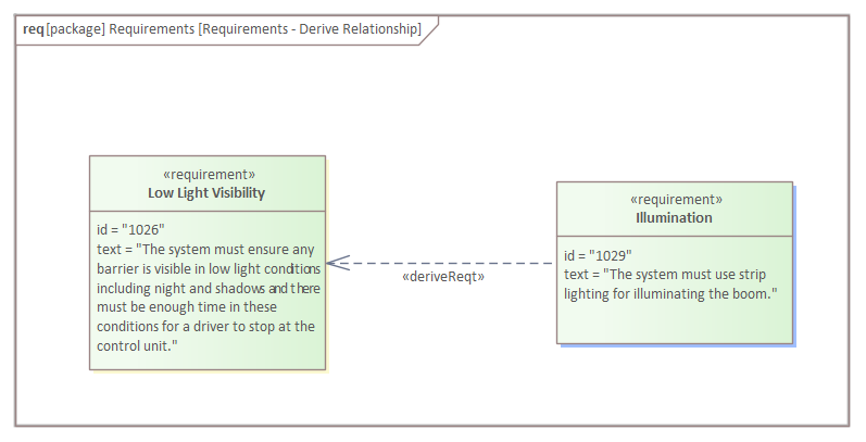 The two Requirements are typically at different levels of abstraction or resolution. A Requirement in a low level specification might have a Derive relationship to a Requirement in a higher level specification. The lower level Requirement is typically derived from the higher level Requirement as a result of investigation, elaboration or analysis. The important aspect of this relationship is that if the Requirement at the arrow end of the relationship is changed, it is highly likely that the derived Requirement will need to be reanalyzed.