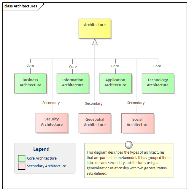 The metamodel is a model of a model that describes the elements and relationships that can be used to construct the architectures. The metamodel functions as a grammar that defines the types and how they can be related to each other. It is critical to have defined the metamodel before any architectural models are created, as it will inform architects what elements they should use and how they can be used together. The metamodel in this format is a passive model and only acts as a guide and communication tool; if a more formal model is required a UML Profile could be created.
