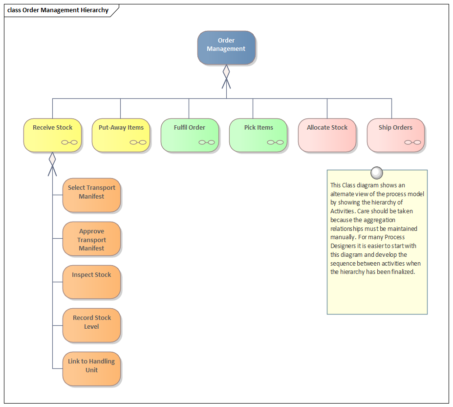 An alternative way of visualizing the hierarchy of activities that make up a business process is to create a Business Process Hierarchy diagram that shows the hierarchy in a structural diagram. This provides a compelling view but care must be taken as this diagram must be updated manually if the structure of the hierarchy is changed.