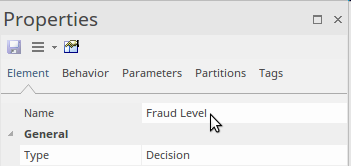 We will create a new Decision, so we will drag and drop a Decision item from the Toolbox onto the diagram canvas. The element will be given a default name of 'Decision1'. Now using the Properties window, typically docked on the side of the diagram, change the element's name to 'Fraud Level' by typing over the default name 'Decision1'.