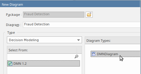 Once a model structure has been set up and the application has been tailored to suit your needs, including the selection of the DMN Perspective and an appropriate workspace, you are ready to start creating diagrams and elements. While it is possible to create an element without first creating a diagram it is common practice to begin by creating a diagram as a canvas for how the elements will be visualized. The first thing you will need to do is choose a location for the diagram in the Browser window. For example, you might be working on a project and have defined a Package called 'Fraud Detection' under the Decision Modeling Package. By selecting the 'Fraud Detection' Package you are telling Enterprise Architect that this is where you want a new Decision Requirements diagram to be inserted.