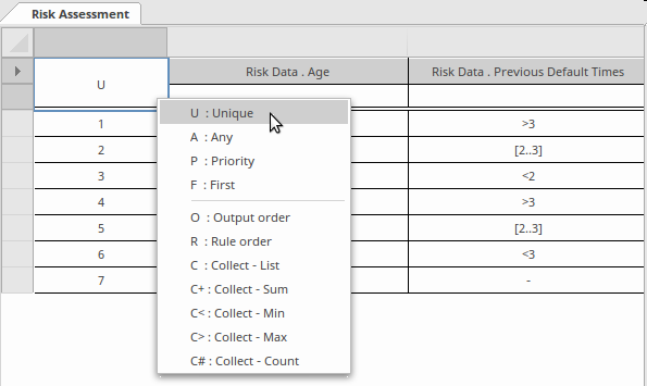 Don't be too concerned about what each of these means as we will discuss them shortly and propose some basic recipes for choosing one Hit Policy over another - if in doubt choose the Unique (U) policy as it is the default and is the most commonly used. Enterprise Architect supports all the defined Hit Policies, and the validation facility - which we will learn about in the next section - uses the Hit Policy to determine whether the rules in a Decision Table have gaps or overlaps.
