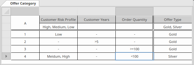 In this example the order of the rules has been defined to facilitate the readability of the table, making the logic more transparent. Notice that the first three rules have the same outcome and have been ordered to make the logic of the table more transparent.