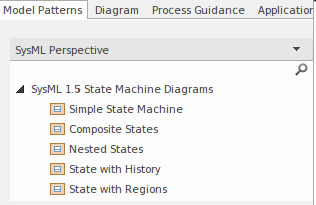 Enterprise Architect helps a modeler to create any number of StateMachine diagrams, and each diagram can have any number of States, Transitions and Pseudostates. Each of these diagram elements and connectors can in turn have other information added that will embellish the diagrams with more detail. The application has a pattern library productivity tool that is very useful for newcomers and welcome equally to experience modelers. This screen capture shows the list of model patterns that can be used to create StateMachine diagrams.