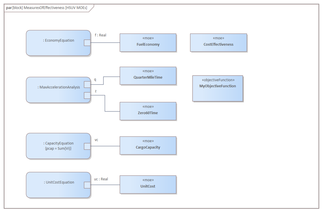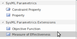 Measures of Effectiveness (MOEs) are an important engineering mechanism used to quantify the achievement of mission objectives or specified desired outcomes. They can be modeled using the Parametric diagram, and the Measure of Effectiveness element is available from the 'Parametrics' page of the Diagram Toolbox, from which it can be dragged onto a diagram and related to parameters of equations represented as ConstraintProperties.