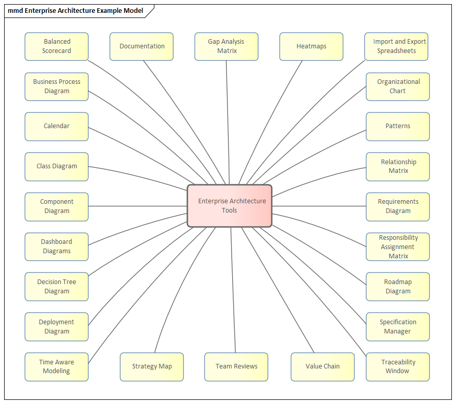 This Mind Map shows the landscape of the key Enterprise Architecture tools that can be used to set up and maintain the architecture office and to plan, create, manage and document architectures. While these are the primary tools there are a series of other tools described in the Help topic Additional Enterprise Architecture Tools.