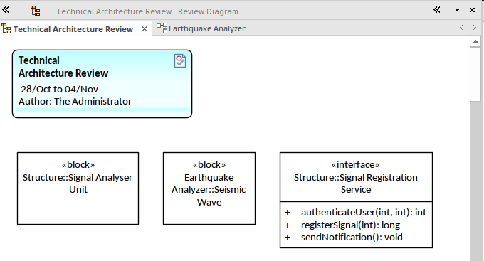 Model Reviews provide an ability for project stakeholders to collaborate formally in the assessment (review) of model content, including elements and diagrams. This handy collaboration tool utilizes a number of built in features - such as the Review view - to manage the process of the review and to visualize discussions and contributions to the review. A review diagram provides a mechanism for participants to add elements and diagrams to the review. This diagram contains a number of elements related to the review topic.