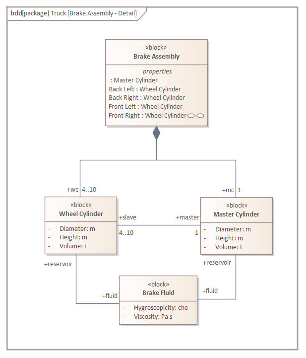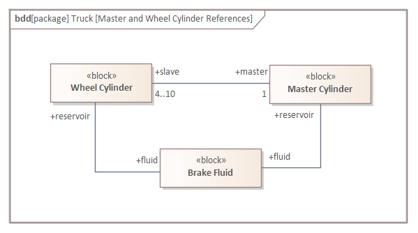 There is however another relationship, the Reference Association (or Reference for short) that can be used to specify relationships between Blocks independent of composition or the notion of one block being a part of another. This provides a very useful mechanism for creating relationships between blocks that are part of different part hierarchies or between any two blocks that are related to each other. For example the Master Cylinder and Wheel Cylinders both have a relationship to Brake Fluid which is used to fill their reservoirs. The Wheel Cylinder could in turn have a relationship to a mechanic that periodically checks the cylinder for leaks that would compromise the efficacy of the braking system. `