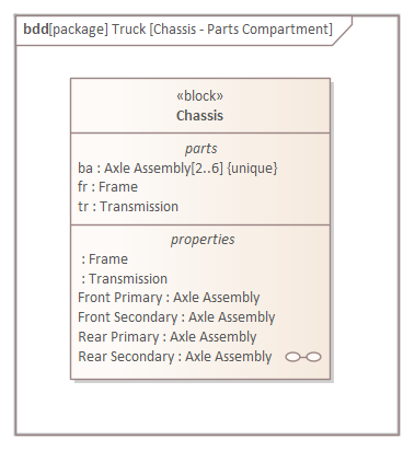 In this diagram the modeler has used the Owning Block's Part compartment to display the Parts owned by the Chassis Block.