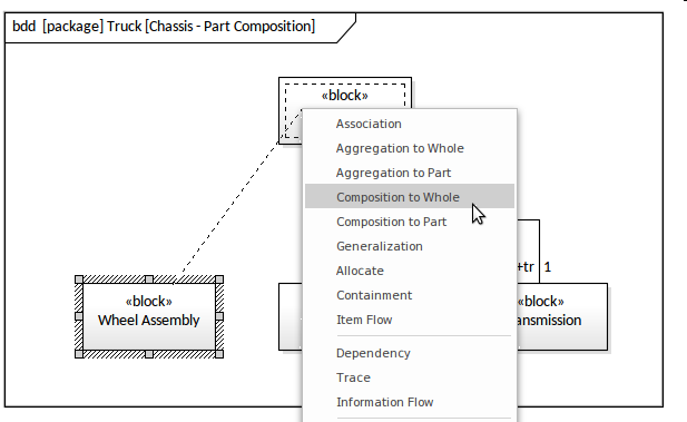 Dragging from the source object to the target will display a menu of possible connectors, and the engineer would choose the Composition to Whole connector. The result will be a relationship with the diamond marker at the Chassis end of the line, indicating it is the whole and the element at the Wheel Assembly end is the Part.