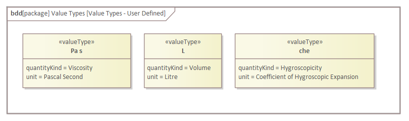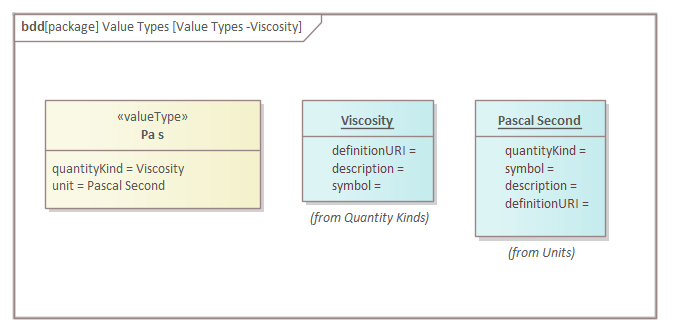 The Value Type has two defined properties - the quantityKind and the Unit. These can also be modeled in Enterprise Architect and give rigor to the application of the Value Type. An engineer will know that the type is based on a quantity (dimension) and a defined Unit. This diagram shows these elements for the  (Viscosity) Value Type.