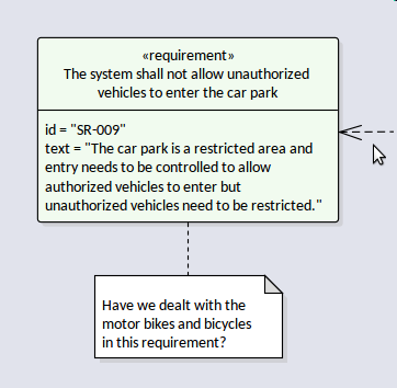 The nine diagrams described earlier are individually specified to convey a particular aspect of an engineering opportunity or solution; for example, the Parametric diagram is intended to show how equations are constructed. There are, however, a number of types of element that are universal to the model endeavor and can appear on any type of diagram. Many of these elements are used on diagrams to convey important annotations to a model or to help explain a particular aspect of the model. They include elements such as Notes, Constraints, Rationales and Views. In this diagram a stakeholder who has been viewing the model has added a comment to question a part of the model.